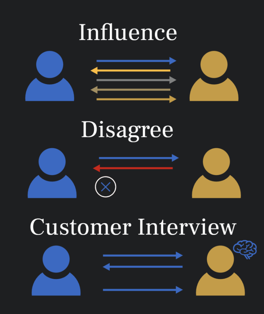 A customer interview is not a conversation. You aren’t there to debate, you are there to gain understanding. This is a very unnatural skill. You need to remain passive in opinion but participate by using active listening. This means showing that you are hearing what they are saying by saying it back. Doing this in a way where you acknowledge/validate what they are saying. This is sometimes referred to as mirroring.