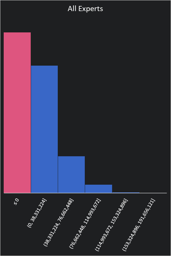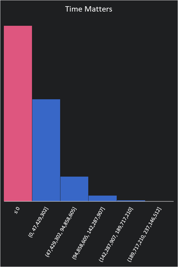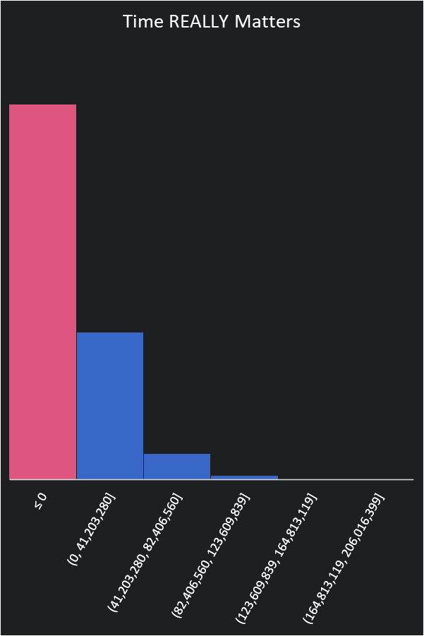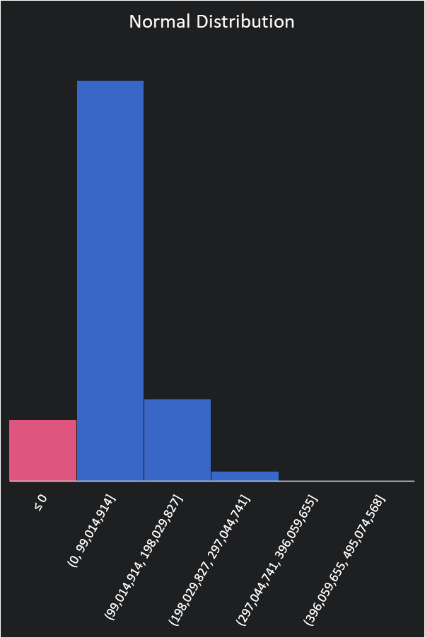 Many possible numbers are in the above ranges, and initially, we assume a normal distribution for each. We will run the simulation 15k times. The higher the number of simulations the more consistent the results. Each outcome is put into a bucket. We want to highlight any number below 0 because in those outcomes we won’t be making a profit. The results of our first simulation look like this:
