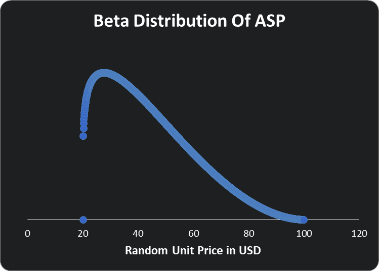 The sales team mentioned they were not confident about the $100 price point. They are more confident that they could get around $35. For this, we will use a beta distribution. This will reflect the more likely ASP: