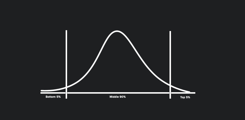 Consider the curves being not of a population but of possible outcomes. A rare outcome may have a huge impact and therefore should not be ignored. The easiest way to see the impact of extreme risk is from an example by Nassim Taleb, “If there is a 1% chance there is botulism in this glass of water would you drink it?” Most of us would say of course not, we’ll find something else to drink. But on average with every other glass of water, it is safe. Rare events sit on either end of a probability curve of possible outcomes. If the range is normally distributed the most likely outcome is somewhere in the middle. Even though the bottom 5% or top 5% outcomes happen rarely, we should care about them because of the impact. If there is a 5% chance there is poison in my glass of water, I’ll have something else.  If there is a 5% chance the product I’m working on will lose more money than the company is worth, then we should probably mitigate that or find something else to work on.