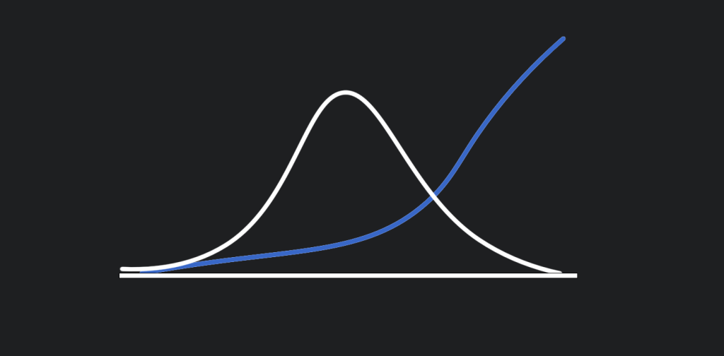 The average of these two societies is the same but the outcome for the individuals is wildly different. A single change to Extremistan, like one wealthy person leaving, can dramatically affect the whole. Now imagine making a product and trying to sell it to both countries because they have the same average income. Likely Mediocrastan will buy way more than the people in Extremistan where you may only sell your product to one person. These two curves have the same average: