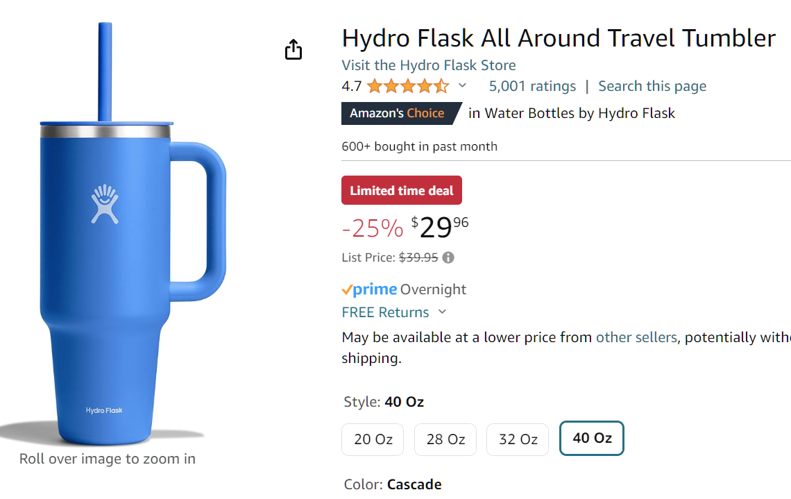- Scarcity—This tumbler used to be expensive. The list price is 39.95, but there is a limited-time deal that gets us 75% off. In one experiment mentioned in the book, test subjects tasted and tested cookies. In one case, they stopped before the test started and took away most of the cookies, leaving only one or two cookies, saying they didn’t have enough for all test subjects. The study revealed the more scarce the cookies were, the better the test subjects rated the flavor of the cookies and were willing to spend more on them.