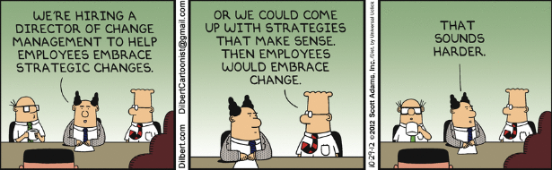 - Typically, changes in process, procedures, and how things are done come with a mandate. Yet, often there is no reward for doing the new thing. At best, there is a punishment. What are the individual’s incentives for changing?