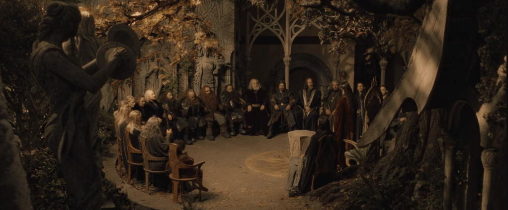 Elrond spends a lot of time reviewing why they are there but fails to give all the information and wastes a lot of time getting to the point. In the book Lord of the Rings, Elrond and Gandalf spend an entire day talking about the backstory of the one ring. Lucky for us, Peter Jackson and his team turned this into the movie’s prologue.