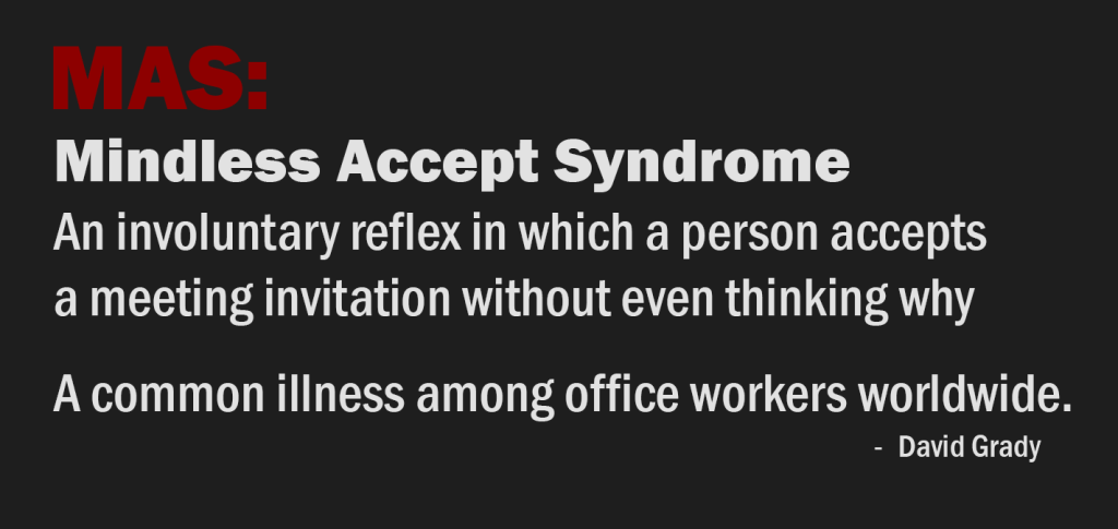 Even if you don’t have this culture at your company, you probably accept meetings and have the power to say no. David Grady has a humorous TED talk about the MAS problem. MAS stands for Mindless Accept Syndrome. Just because you receive an invite, don’t attend just because it is from Elrond.
